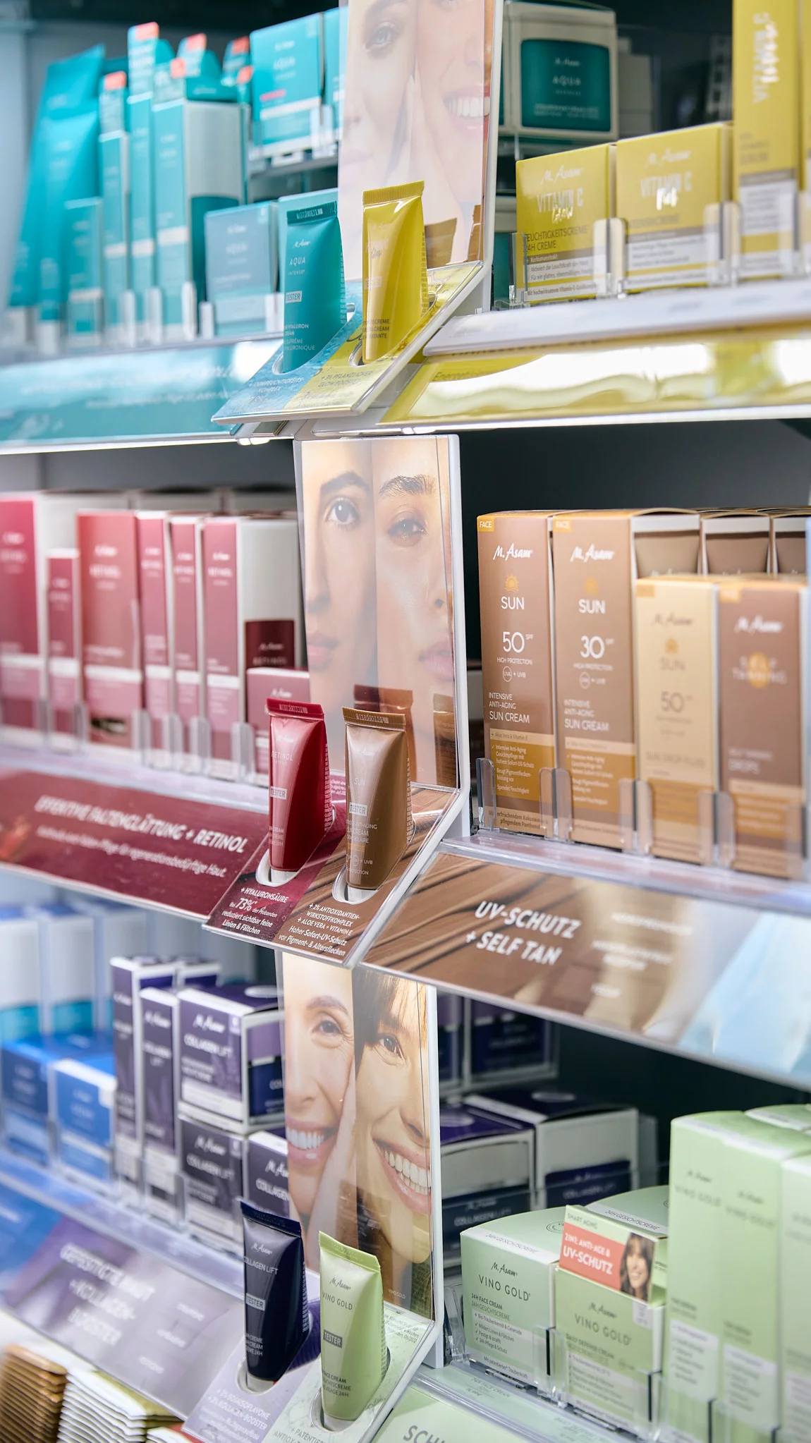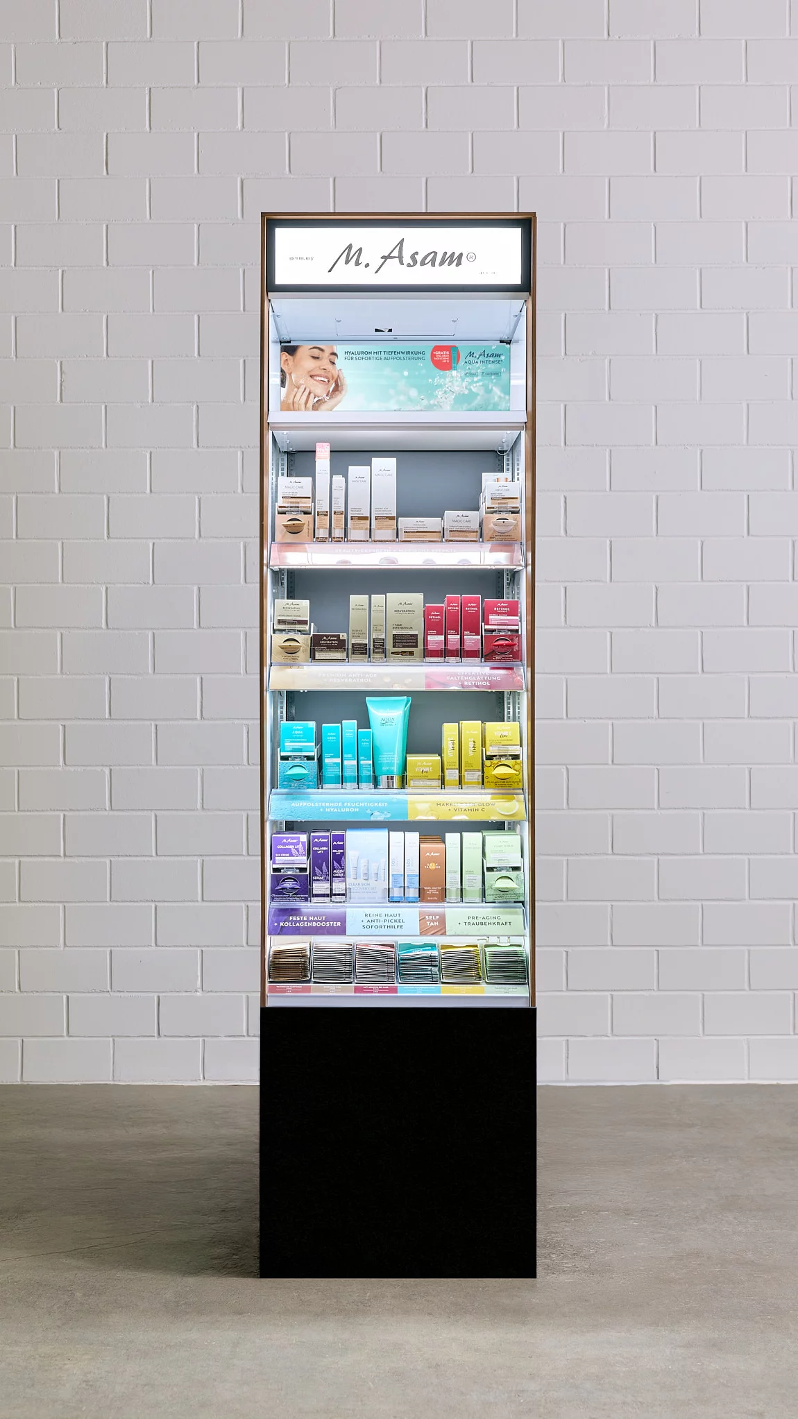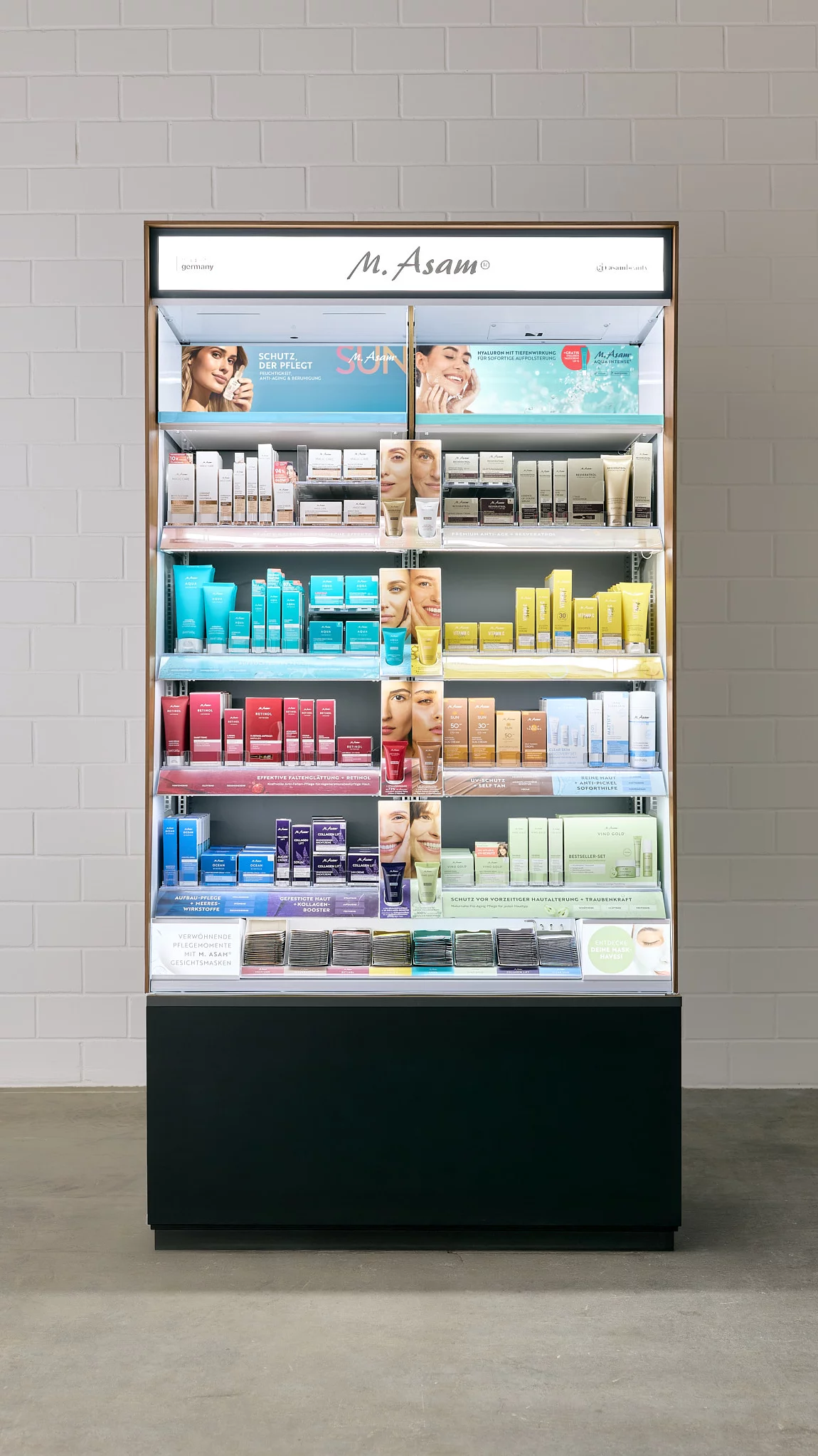 Für die Marke asambeauty entwickelt und produziert ARNO die 2. Generation der Kosmetiktheke für die pflegende Kosmetik. Die überarbeitete Version besticht neben ihrer Klarheit durch viele weiße Elemente durch elegante braune Akzente, gefertigt aus dem Rebenholz echter Weinreben. Die harmonische Farbgebung ermöglicht eine klare Kategorisierung der Produkte und sorgt für eine aufgeräumte Präsentation. Zudem überzeugt die Theke durch ihr Beleuchtungskonzept und ihre hohe Flexibilität, was unter anderem dem Aufbau ohne zusätzliche Einsatzteile zu verdanken ist. Die Kosmetiktheke ist in Müller-Drogerien in drei verschiedenen Größen zu finden, sodass sie sich optimal in jede Filiale einfügt.