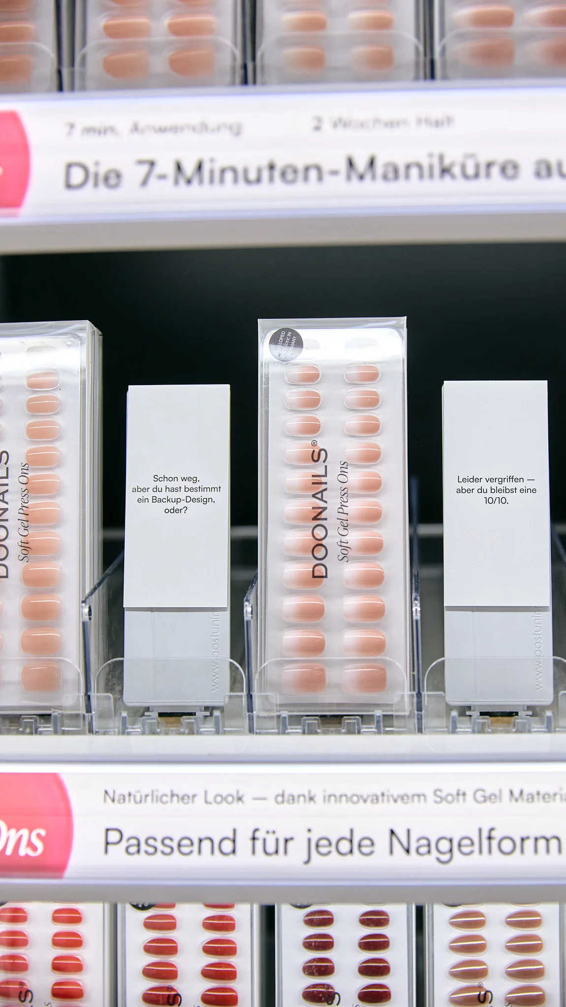The generous graphic areas on the front and side walls of the shelves create space for brand storytelling and inspiring imagery. The bright product packaging provides the perfect contrast and emphasises the clean, high-quality appearance. Integrated product sliders ensure order and optimal presentation at all times. When the last product is removed, a temporary out-of-stock situation occurs, which DOONAILS uses to strengthen its brand image.