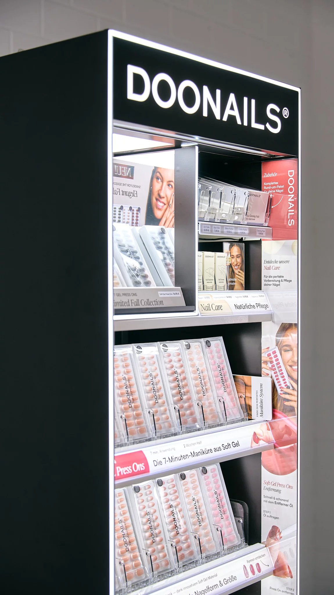 To transfer the successful online concept to the real shopping world, ARNO developed a 0.5m counter that perfectly showcases DOONAILS products. The compact black metal unit combines brand aesthetics, functionality and emotional appeal in a minimal space.